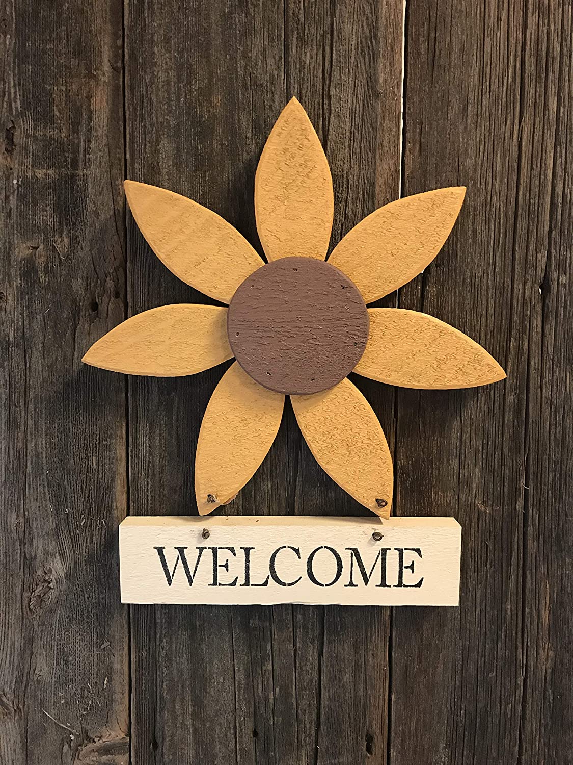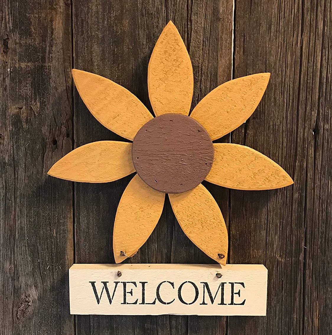 This Welcome wood flower makes a beautiful addition to your door , shed, barn, or garden. Cut from 1″ rough sawed pine. Hand painted with exterior paint, no additional treatment needed. Welcome Wood Flower is 15 inches wide and 17.75 inches high. Color : Sunflower Yellow.